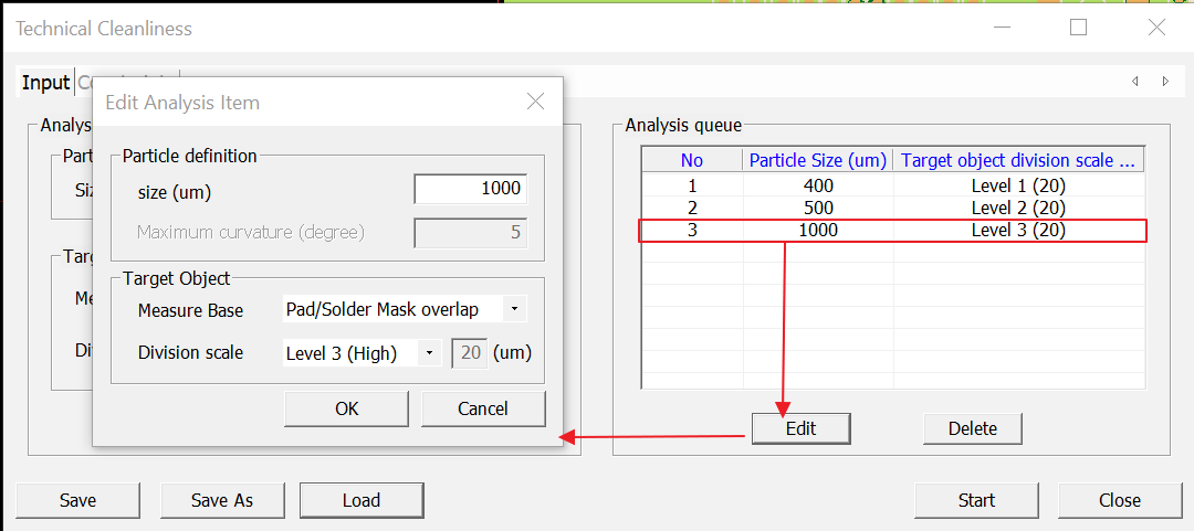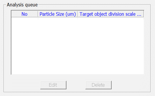 Analysis queue lists the parameters for the particle size and selected target object scale to analyze. This menu helps edit or delete the data setting list.