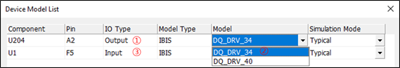5. Device Models: For the selected active driver, actual driver model can be selectable among many different models in IBIS or Linear device model types. You can use one of available models considering the output impedance, driving capability measured by output current level and operating frequencies. These driver’s characteristics lead huge impact on the simulated waveforms.