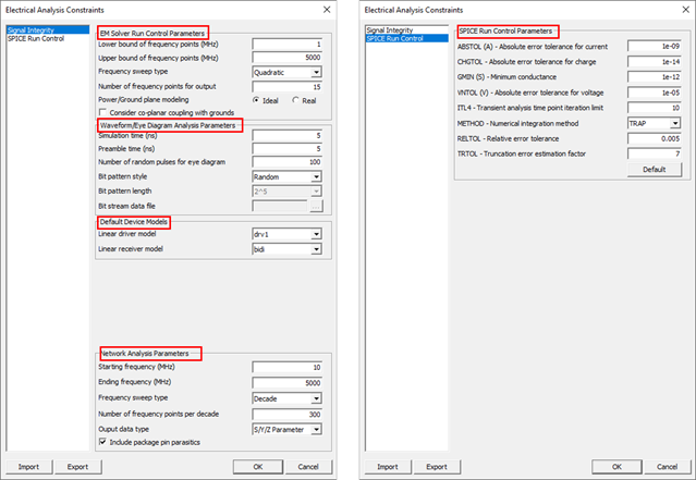 View editable versatile control parameters which influence the simulation/analysis results for network, electromagnetic field, eye-diagram, and SPICE.