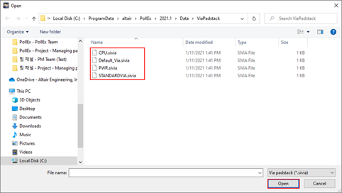 2. In the file explorer, navigate to and select the desired via padstacks.