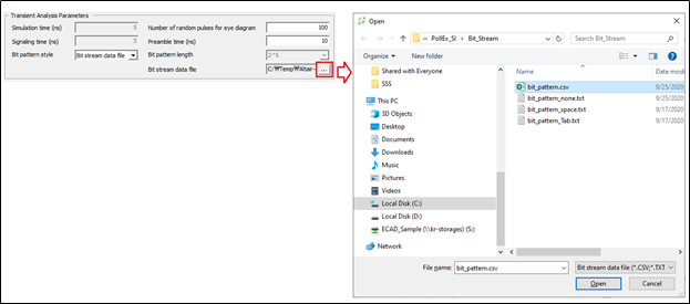 12. Bit pattern style: when you select the Eye diagram analysis, you can change the random bit generation algorithms among Random, ABS, PRBS, Periodic and Bit stream data file. By using the Bit stream data file menu, you can import the file where the arbitrary bit stream is defined.