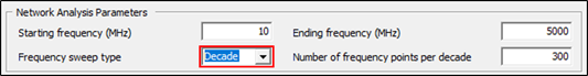 • Decade: Network parameter will be solved for 300 frequency points, 50 points from 1MHz ~ 10MHz, 10MHz~100MHz and 100MHz~1000MHz respectively.