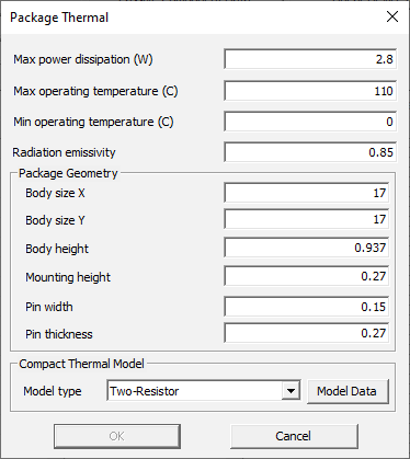 Click Package Thermal. The Package Thermal dialog displays. Define thermal properties of a component part, such as maximum power dissipation of the device and compact package thermal model data.