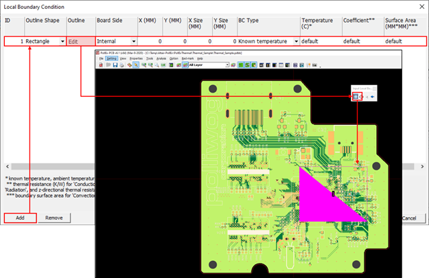 To override the global boundary conditions, you can define local boundary conditions to specific board surface areas in the Local Boundary Condition menu. Add is used to define a new local boundary condition. For each board local boundary condition, the local board area outline shape (rectangle or circle), board side (top, bottom, or internal), location, size, and boundary condition data need to be specified. The area outline shape, location, and size can also be defined by drawing the area on the board after clicking Edit.