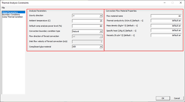 Built-in and user-defined global thermal analysis parameters can be managed in Analysis > Thermal Analysis > Thermal Analysis Constraints. Upon selecting this menu, the Thermal Analysis Constraints dialog displays. You can review and modify global parameter values in the Global Parameters tab.