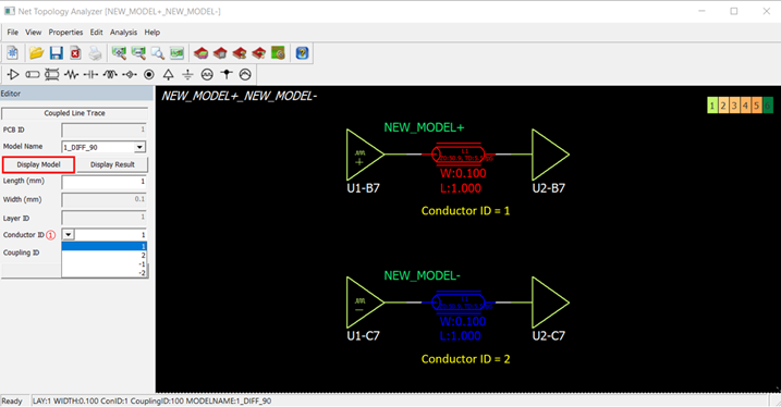 For extracting frequency-dependent parasitic parameters of the model, users can change the analysis control parameters such as lower and upper bounds of frequency points, number of frequency points for output, and frequency sweep type. Add Conductor menu is used to add conductor or ground traces to the model. For each trace (conductor), users need to select the conductor type (Conductor or Ground) and signal layer and define the conductor width and location. Display Model menu is used to graphically display the transmission line model.