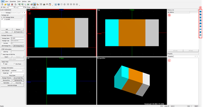 Package pin lead shape is displayed. Front, Top, and Left side view and Perspective of the shape are supported.