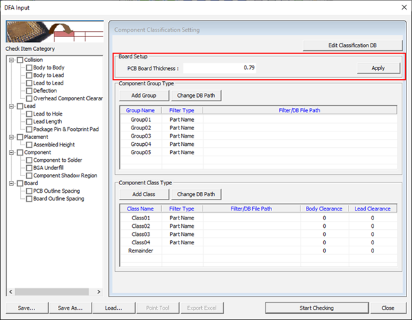 Some of PollEx DFA checking items, Lead Length and Assembled Height, require board thickness during checking. Before checking, you need to define board thickness information.