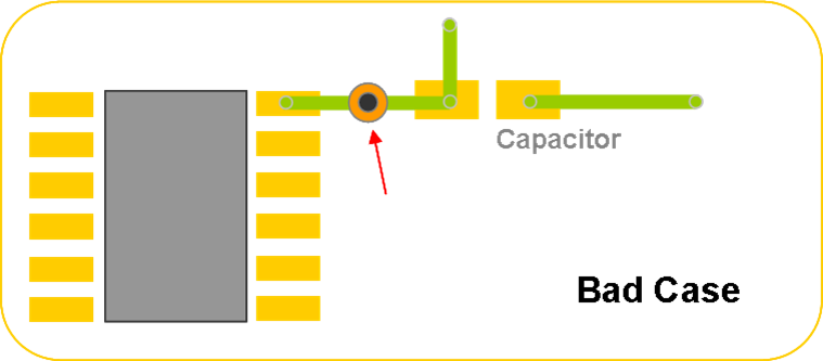 If via is placed between capacitor and IC component as depicted below, it makes unexpected problems because unstable power will be supplied to IC component pin.