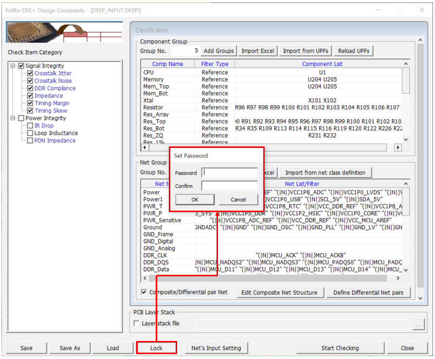 - Use Input File Lock: DFE+ input rule file (*.DFEPI) can be locked to prevent any modifications from users. The purpose of the input file encryption is to keep a uniform set of rules throughout without tweaking them for certain application once the input setup is done by a designated person. Locked DFE+ input file can be used to verify a PCB design and only tweaked by the designated person. If you check the above option, the Lock button in Input dialog is activated and you can specify and save a password as shown in the figure below.