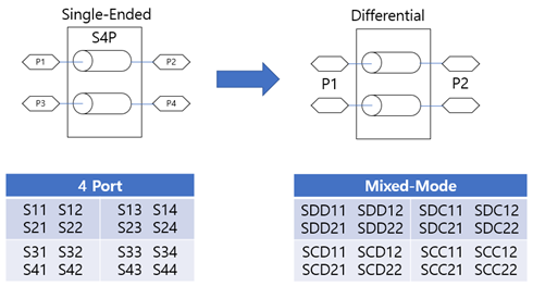 • Added a feature to the network parameter mode conversion for 4-port S-parameter in the Network Parameter Viewer dialog. To check the S-parameter against industry standard compliance plots, the single-ended measurements need to be converted to a mixed-mode matrix.
