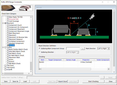 • Added a new AOI/AXI feature under the Placement category in DFM. Use to check components on the board that obstruct the field of vision by the height of specific parts.