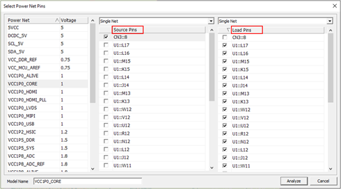 • In the Select Power Net Pins dialog of PI, the structure is changed so that the source/load pins can be set at the same time.