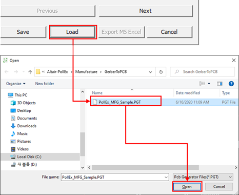 - Click Load and select the PollEx_MFG_Sample.pgt file from C:\Temp\Altair-PollEx\Manufacture\GerberToPCB.