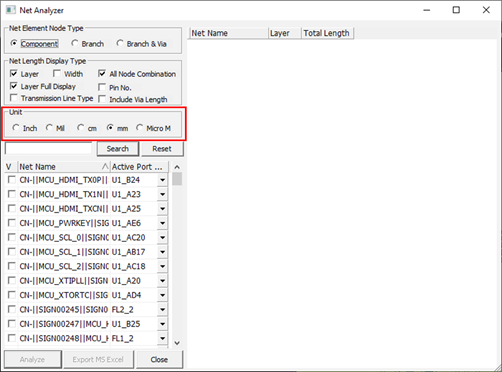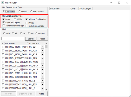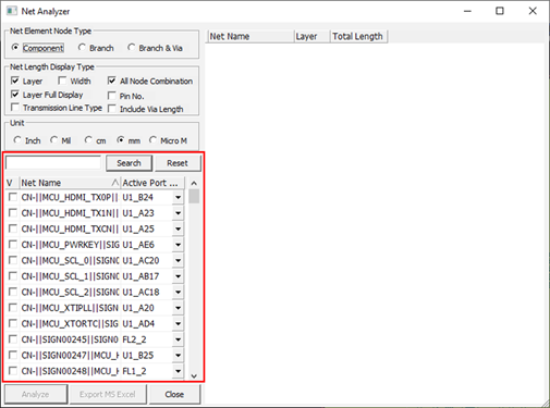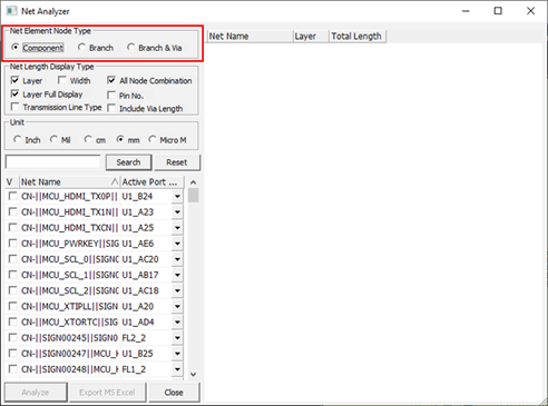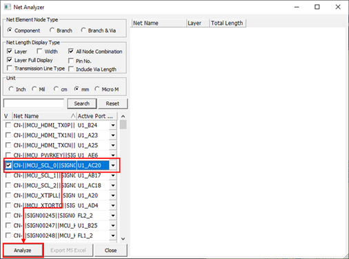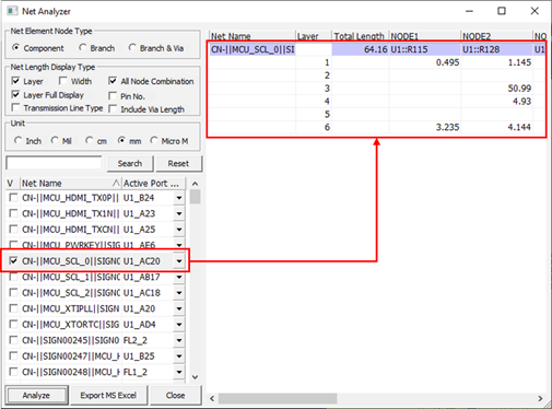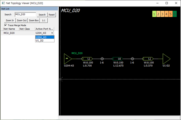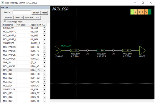 Use the Net Topology Viewer to check a net with a topology structure (Driver-Load-Receiver) including connected Vias and Branches. The viewer configures the net length and width of a trace and a component by displaying different colors per layer.
