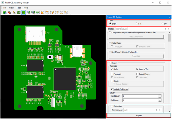 In the Real PCB Assembly Viewer dialog, click File > Export to 3D Data.