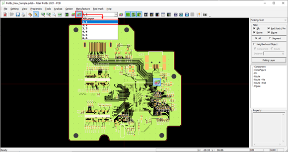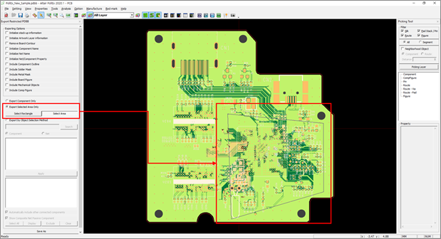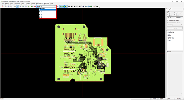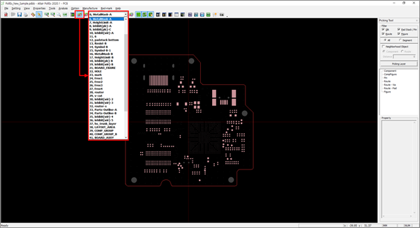 The Picking tool is used to check the object information and property included in the PCB design data. When the PollEx PCB program is initiated, the Picking tool is automatically enabled on the right-side of the application.