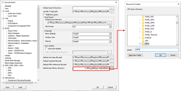 - From the Environment dialog, click the ellipses at the end of the Default part library directory field to define the default 3D part librarian path.