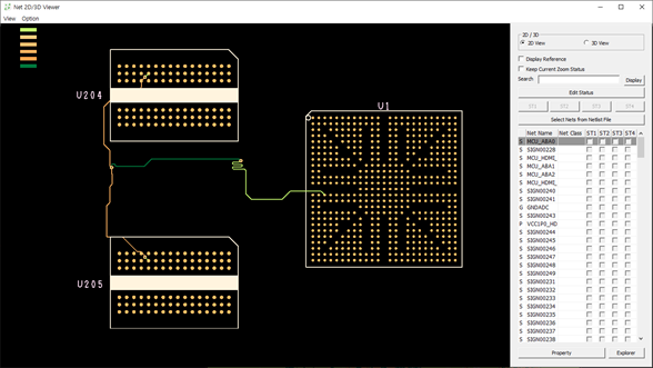 Use the Net 2D/3D Viewer to check nets connectivity and their three-dimensional structures. Run the Net 2D/3D viewer to see a 2D image with net lists and connected components, as shown in the following image.