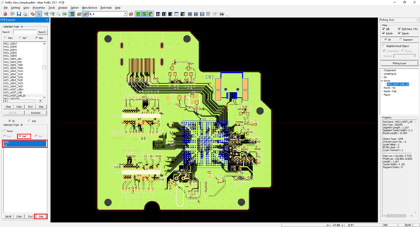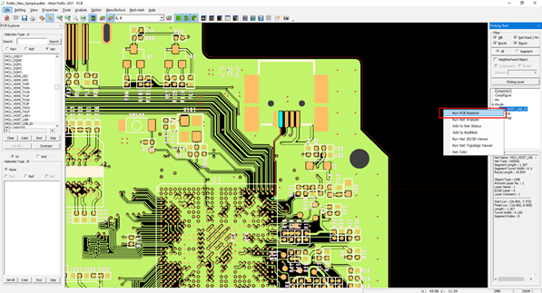 - From the PCB Explorer, use Selection Type A and B to check the connected part, reference, and net name.
