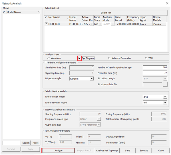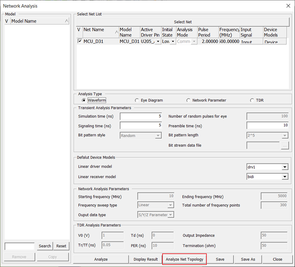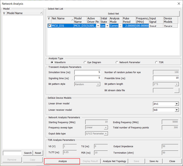 From the menu bar, click Analysis > Network Analysis for the waveform analysis setup.