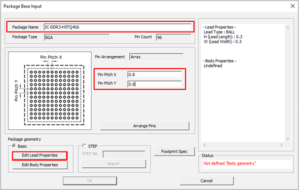 Figure 16. - In the Package Lead Editor, define the lead type as BALL, specify the size, and click OK.