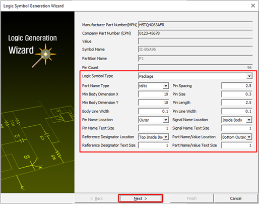 In the logic symbol generation wizard, enter the dimension size of pins