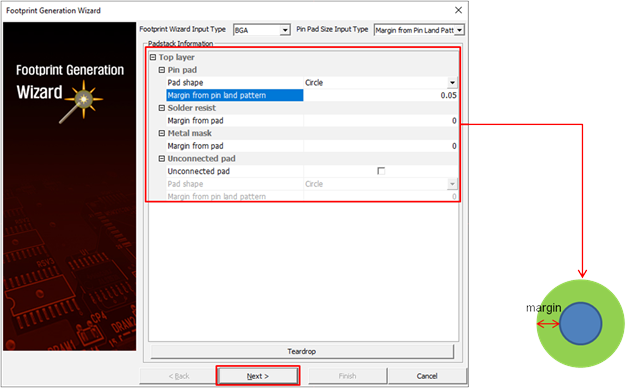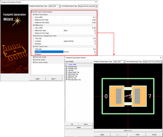 - In the Footprint Generation Wizard window, enter the Pin pad, Solder resist, and Metal mask information.
