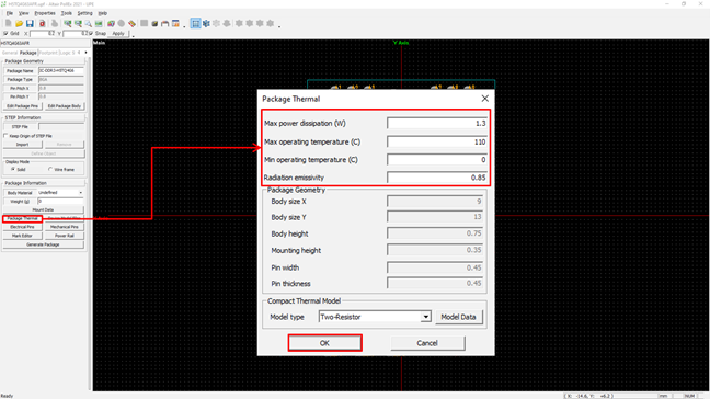 - From the menu bar, click Package > Thermal in the Package tab to add package thermal characteristic properties.