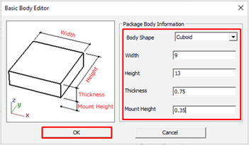 - In the Basic Body Editor dialog, select the body shape and input the body size by referring to the datasheet.