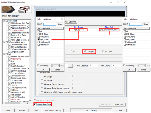 To check if high speed signal cross over split plane, you will define power/ground net group and define target net group, high-speed net group.