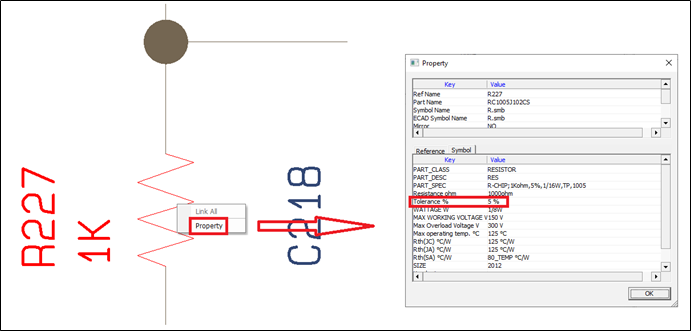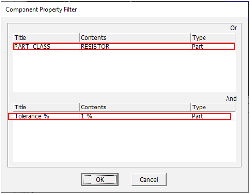 In the Component Property Filter dialog, the new PART_CLASS property is added in the OR section. Tolerance % is added in the AND section of the Component Property Filter dialog.