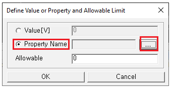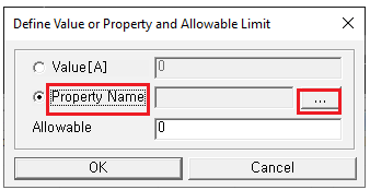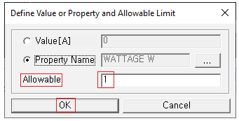 The Define Value or Property and Allowable Limit dialog opens. You can assign maximum allowable rated Power Dissipation level by entering value or specifying the property name where the Power Dissipation value is defined.