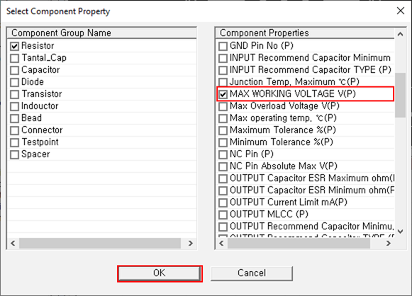 Figure 80. - Enable the Resistor and MAX WORKING VOLTAGE V(P) checkboxes and click OK.