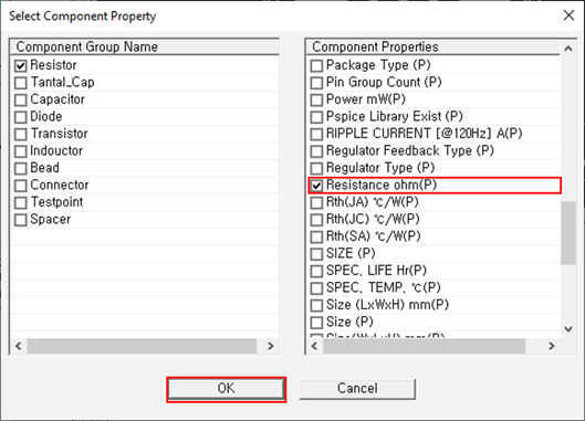 - In the Component Properties section, enable the Resistance ohm(P) checkbox.