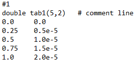 A table is declared by its datatype (e. g. double), followed by the table name (e. g. tab1) and its dimensions in brackets (e. g. (5,2)). Multiple tables can be defined in the same text file. The table declaration is followed by the actual data. The first column of the table represents the input of the 1D table, whereas the second column lists the corresponding output values. The input values of the table must be arranged in increasing order. The output of the table must be the cross-sectional area (in m²). The component interpolates linearly between the listed input values. More information regarding the format of tables can be found in the component CombiTable1Ds.