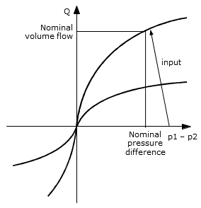 Based on the parameter Flow coefficient alphaD and a look-up table for the Cross-sectional area as a function of the input signal, the flow rate is calculated according to the formula given below: