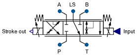 Port LS is connected to port A if Stroke > Relative stroke at which the LS port is switched, port LS is connected to port B if Stroke < -Relative stroke at which the LS port is switched. Pressure at port LS follows pressure at A, B or T with first order delay with Time constant of LS signal.