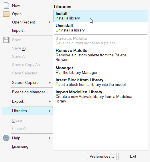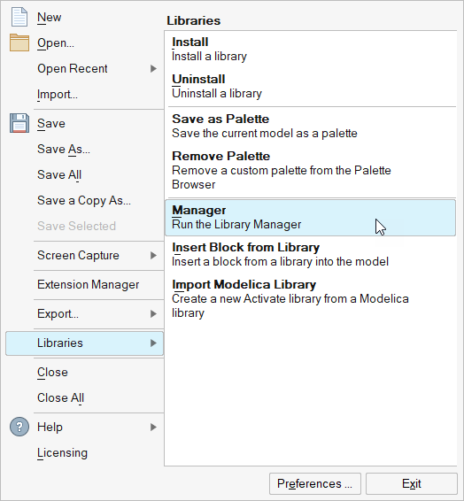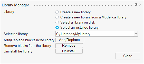 The Library Manager includes options for adding, replacing, and removing blocks in libraries, and installing/uninstalling libraries that have been added to Activate.