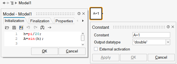 The variables h and A are defined in the Initialization script of the model. The Constant block has three parameters: Constant, named C; Output datatype, named typ; and Extern Activation, named externalActivation. The block parameter C is defined by the expression A+1 where A is defined in the Initialization script. The other parameters: typ and externalActivation are defined directly by a string value and a checkbox. Here the model parameters are h, A, C, typ and externalActivation; the block parameters are C, typ and externalActivation; and the simulation function of the block (which depend on the data type) has one parameter having the same value as the value of C. Note however that the parameters of the simulation function of a block do not always correspond exactly to the parameters of the block. For example, the block realizing a transfer function (ContTransFunc) has for parameters the numerator and the denominator of the transfer function, but the parameters of the corresponding simulation function are the A, B, C, D matrices corresponding to a state-space realization of this transfer function.