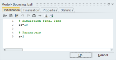 On top of the main diagram context, the software applies an initialization script, which is yet another OML script that is executed at the beginning of the simulation process. The main purpose of this script is to define the variables or functions that are required throughout the model during a simulation.
