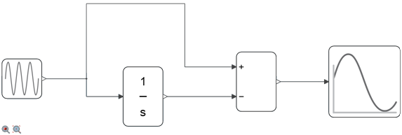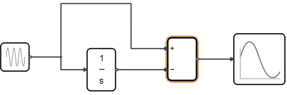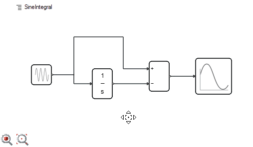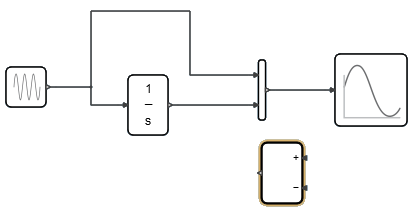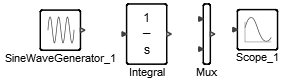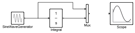 7. Link the remaining blocks in the diagram as you see in the following figure. Note the bend in the link between the first two blocks. If your link is straight, create the bend by selecting the SineWaveGenerator block and moving it upward so that it is higher than the Integral block.