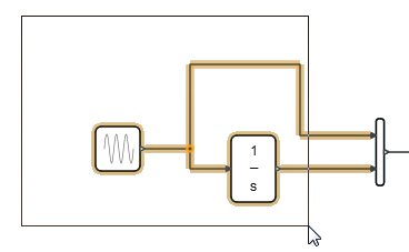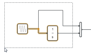 7. To delete multiple blocks and links at once, you can box-select a section of the diagram, and then delete and restore the section as above. From the upper left-hand corner of the diagram, click and drag downward and right to select the portion of the diagram containing the SineWaveGenerator and Integral blocks.