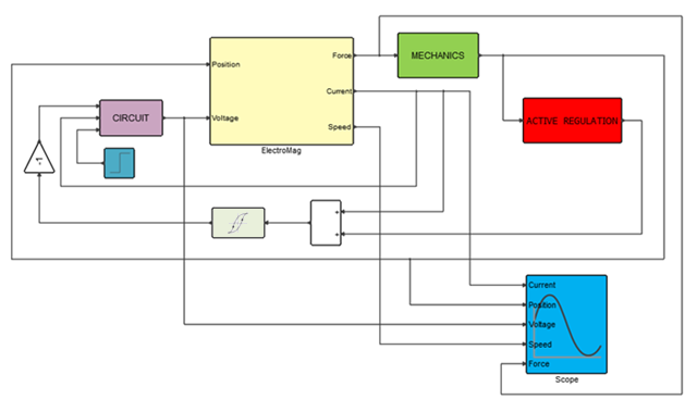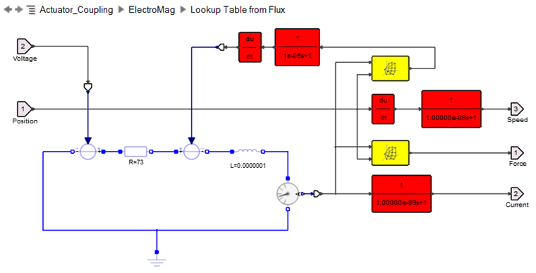 The ElectroMag super block (yellow) of the Activate Coupling model (Actuator_Coupling.scm) contains the electromagnetic component of
