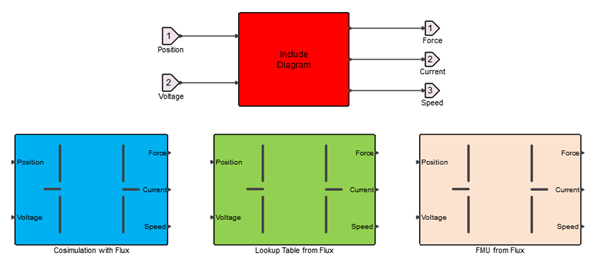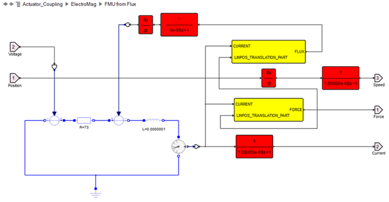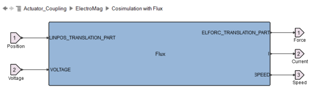 The super block Actuator_Coupling > ElectroMag > FMU from Flux includes a context to read in the results exported from a