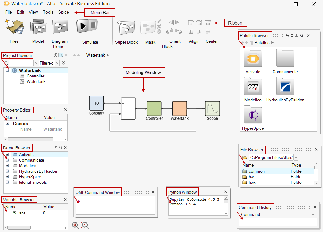The ribbon is the area of the GUI where you can access a variety of modeling and simulation tools. Some tools are arranged into tool groups. Hovering over a tool group highlights the individual tools in the group. The File, Edit, View and Tools pull-down menus provide access to basic functions of the software. The Project Browser displays a tree view of all model data open in a current session. The Property Editor displays the properties of a selected object and enables you to assign properties such as a name to various objects in a model. The modeling window is the area in the workspace where you construct models using a hierarchical system of block diagrams. The OML command window lets you enter individual OML commands to create or modify block definitions; create, edit or simulate models; manipulate elements inside of diagrams; and define functions for the pre- and post-processing of data required for model simulations. The Command History window displays the OML command history for the current session. The Demo Browser provides easy access to models and other model-related files. The Variable Browser provides access to all variables available for the current session. The File Browser displays the files in the current working directory. The Palette Browser provides access to the library palettes which hold collections of predefined and user-defined blocks. The Python command window lets you enter individual Python commands supported by the Python interpreter (3.5.4 for the current release) included with Activate.