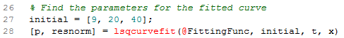 From the data plot and some calculations, we can estimate the fitting parameters. These initial estimates are required inputs for lsqcurvefit. The other inputs are the t and x raw data values.