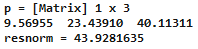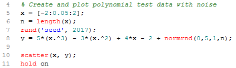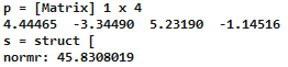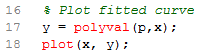 The output is shown below. The first output, p, contains the fitted polynomial coefficients. The second output, s, contains statistical data. Only the norm of the residuals vector is shown here.