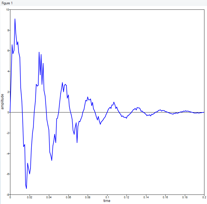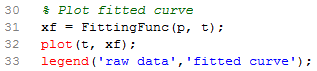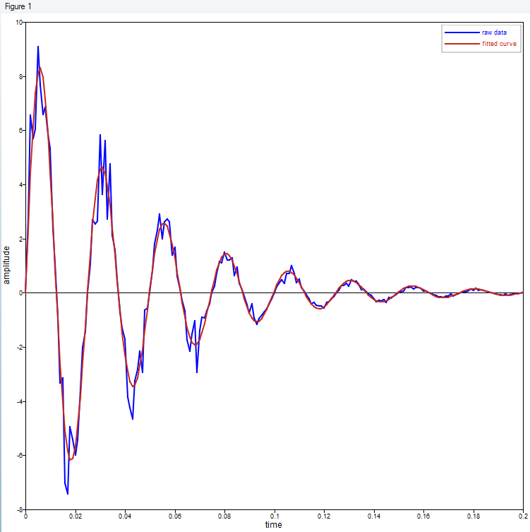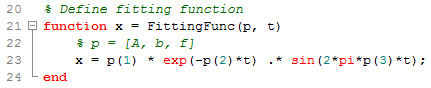 The parameters for the fitted curve are the amplitude, the exponential damping coefficient, and the oscillation frequency. The parameters are designated A, b and f, and they are passed to the fitting function in a vector as the first argument. The second argument is the vector of times at which the function is to be evaluated.