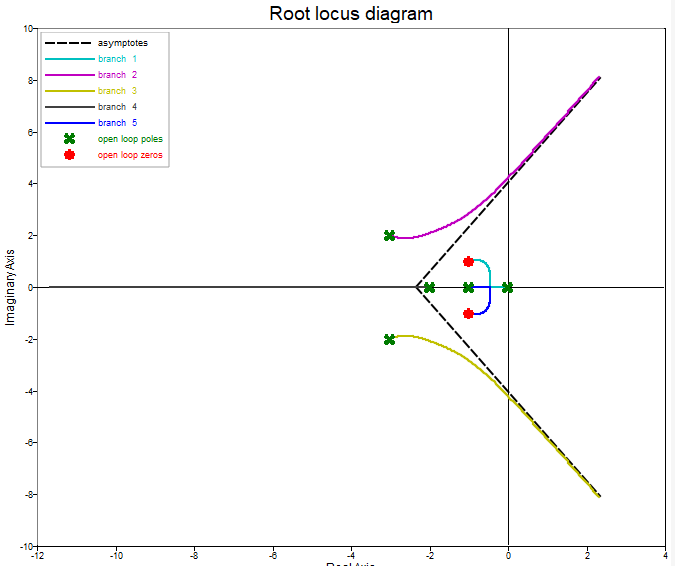 - The plotted closed-loop poles. Each column contains the poles for a gain value, and each row traces a branch of the locus.